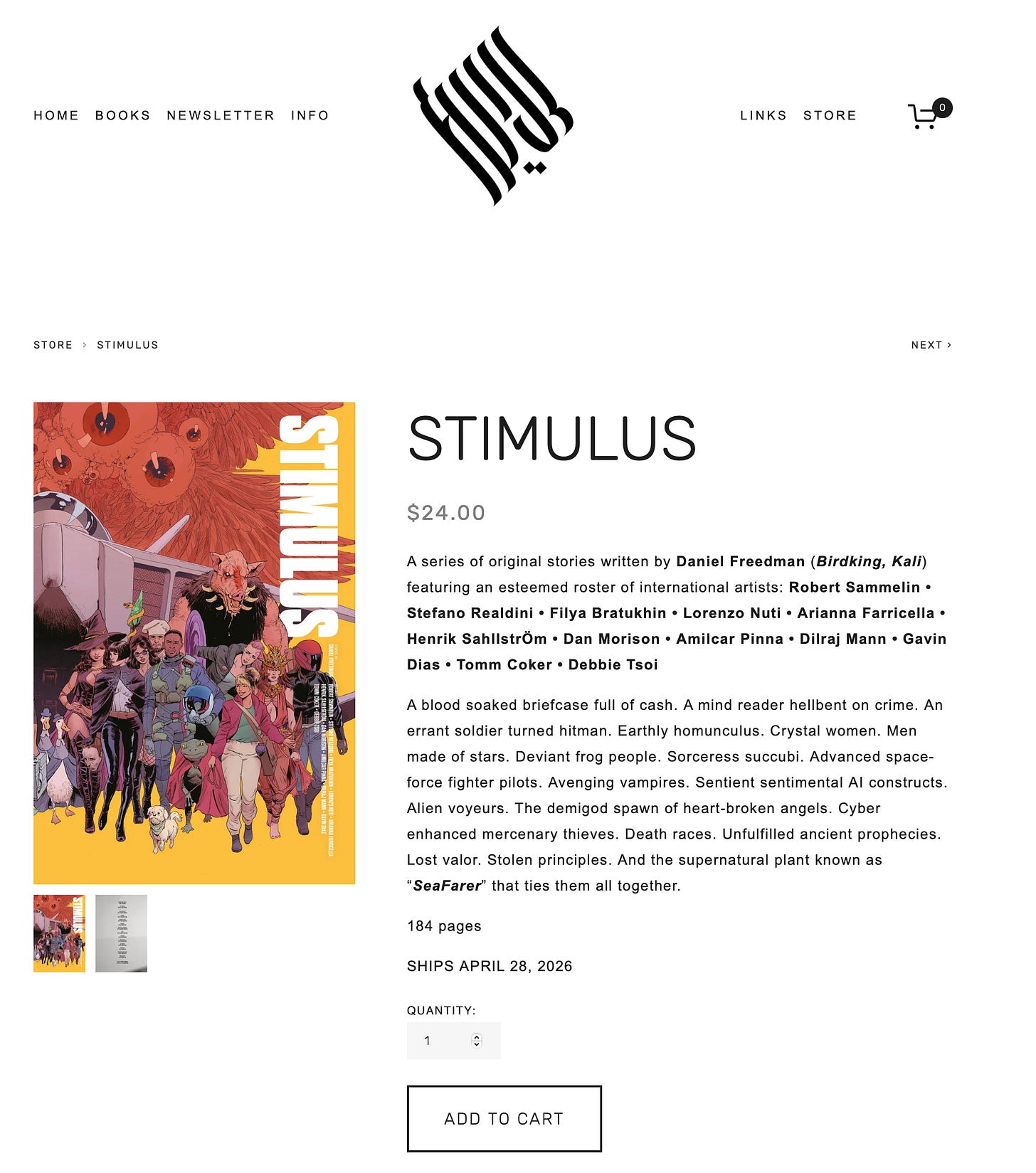 Explore the interconnected cosmos of Stimulus when the 184-page (6.625x10.1875”) paperback volume arrives in bookstores and comic shops on April 28 and 29, 2026 for $22.99. Pre-order now from Amazon, Barnes and Noble, or your local bookstore or comic shop. Visit Comic Shop Locator or Bookshop.org for more details and stores near you.